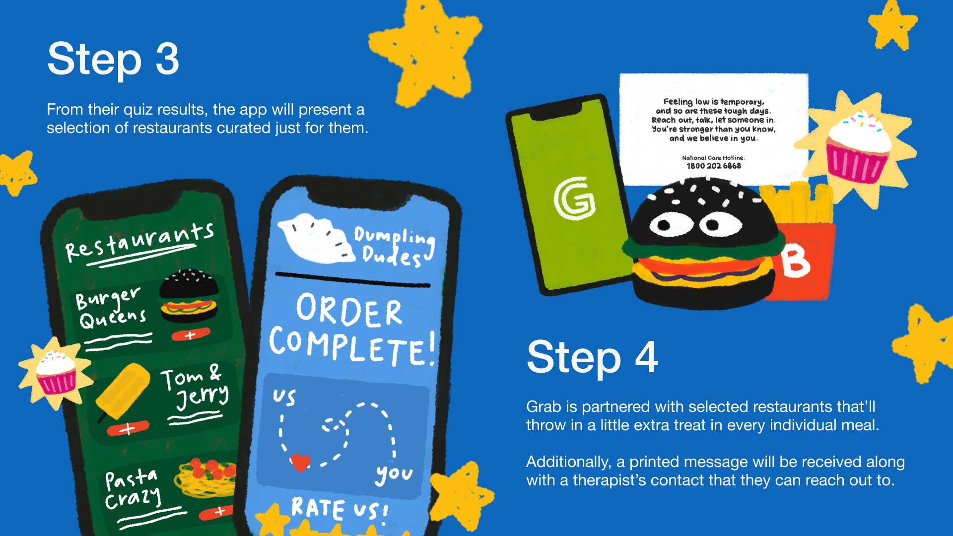 "Extra Love" intervenes by integrating into the Grab delivery app experience, aiming to brighten up users' days and encourage perseverance through tailored messages and gifts based on their order history and responses to daily quizzes. Additionally, "Extra Love" promotes sharing and social connection by encouraging users to share these personalized messages, fostering a larger community of support and awareness online.